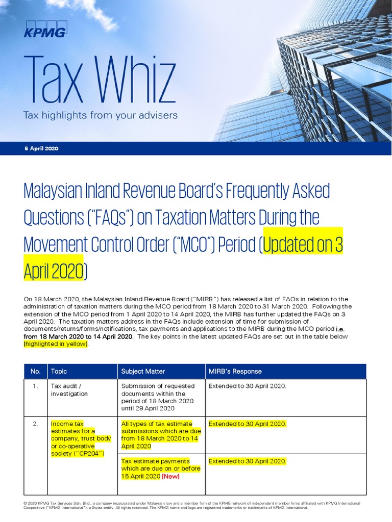 Malaysian Inland Revenue Board S Frequently Asked Questions Faqs On Taxation Matters During The Movement Control Order Mco Period Updated On 3 April 2020 Small And Medium Sized Enterprises Taxpayer