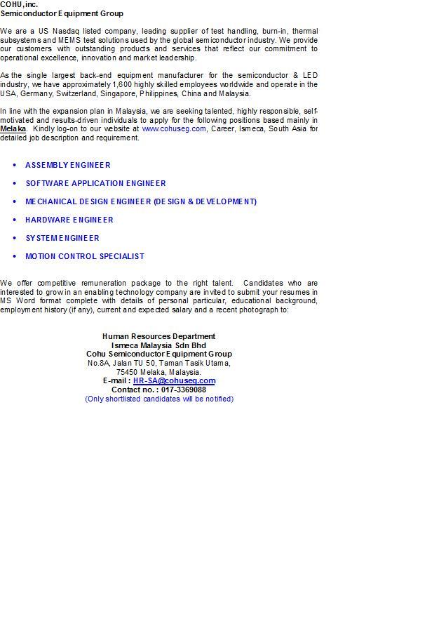 Mfuc Malaysia On Twitter Job Offer Engineers Ismeca Malaysia Sdn Bhd Cohu Semiconductor Equipment Group Melaka Http T Co Wwvxfluucw