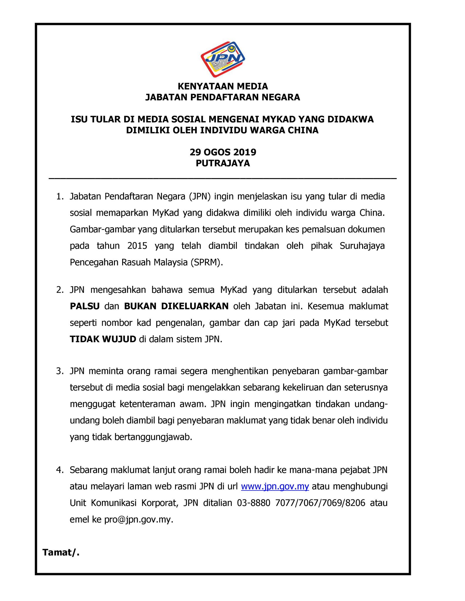 Jpn Malaysia On Twitter Kenyataan Media Jabatan Pendaftaran Negara Isu Tular Di Media Sosial Mengenai Mykad Yang Didakwa Dimiliki Oleh Individu Warga China Https T Co Pl7d2bil7m