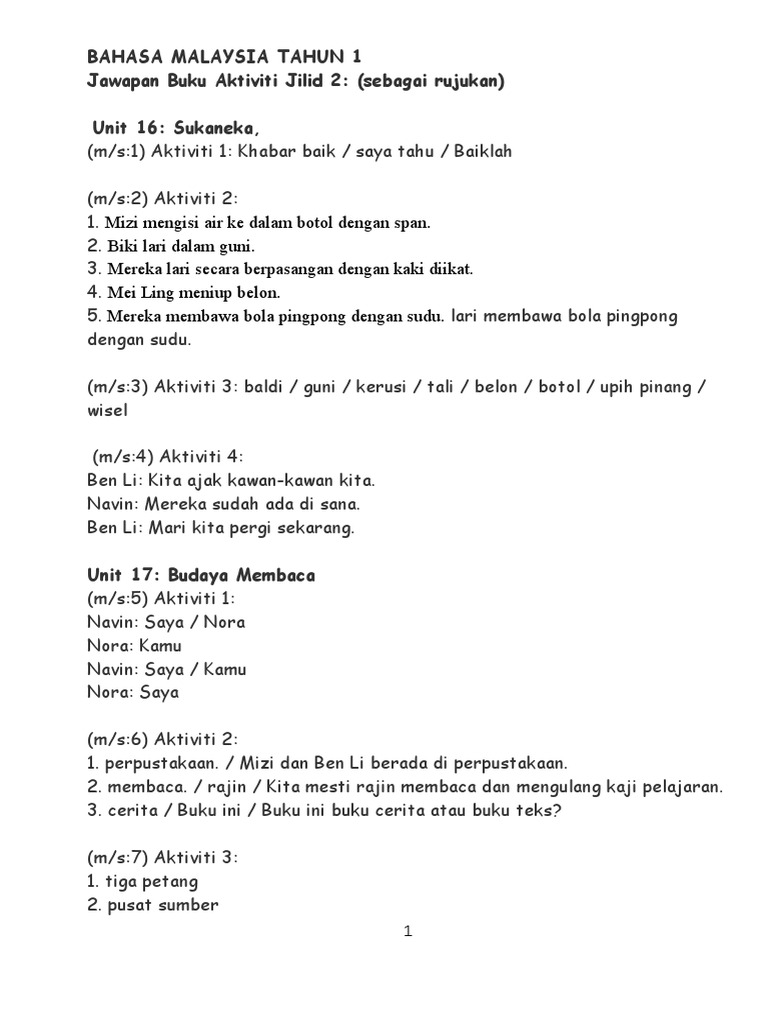 Jawapan Buku Aktiviti Bm Tahun 1 Jilid 2