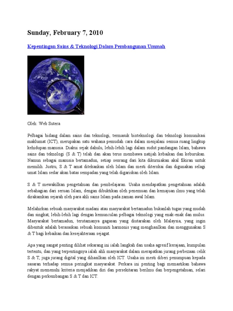 Kepentingan Sains Teknologi Dalam Pembangunan Ummah