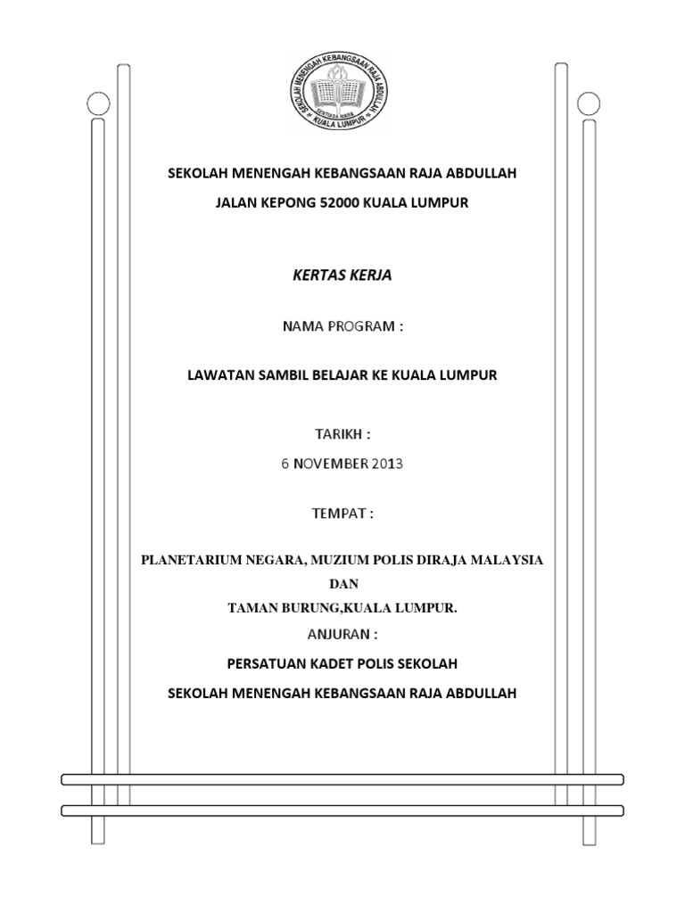 Kertas kerja cadangan program lawatan sambil belajar ke shah alam dan melaka. Pakej pengangkutan bas dan penginapan 40 orang peserta bas. Lampiran pk 15 2 kertas kerja program aktiviti tajuk. Lawatan sambil belajar di kilang teh boh 7 0 anggaran perbelanjaan lampiran 1 8 0 tentatif program lampiran 2 9 0 ahli jawatankuasa pelaksana program lampiran 3 10 0 penutup lawatan ini bertujuan memberi maklumat luar yang boleh dikongsikan bersama agar dapat mempertingkatkan motivasi bagi kecemerlangan akademik.