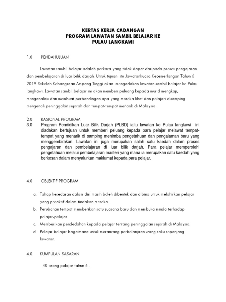 6 0 aktiviti yang dijalankan i. Kertas kerja cadangan lawatan sambil belajar pulau langkawi tarikh 28 30 oktober 2010 pengenalan pulau langkawi merupakan salah sebuah pulau di malaysia yang sangat terkenal dengan keindahan. Kertas kerja lawatan sambil belajar i.