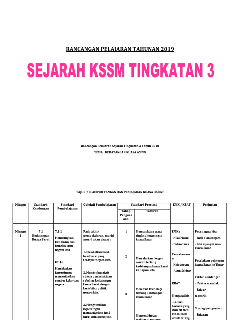 Rancangan Pelajaran Tahunan 2019 Rancangan Pelajaran Sejarah Tingkatan 3 Tahun 2018 Tema Kedatangan Kuasa Asing