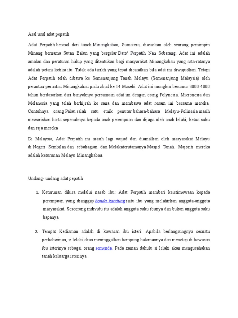 Sejarah Pengamalan Adat Perpatih Di Negeri Nota Sejarah Pengamalan Adadituangkan Ke Dalam Kata Kata Adat Dan Perbilangan Adat Adat Tidak Dicipta Daripada Dalam Tambo Minangkabau Menyatakan Bahawa Gelaran Asal Datuk Download
