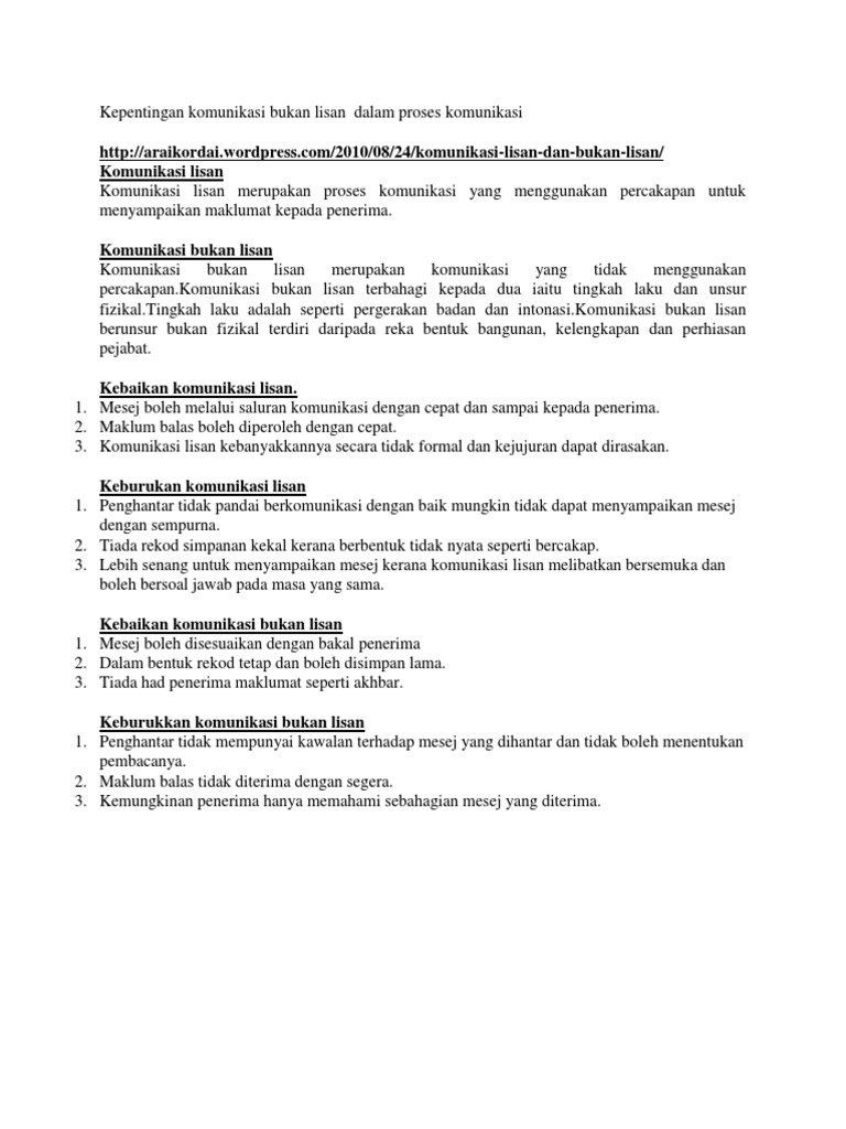 Komunikasi lisan dan bukan lisan. 3 jenis komunikasi bukan lisan. 1 komunikasi bukan lisan boleh didefinisikan sebagai semua jenis komunikasi yang tidak melibatkan perkataan. Komunikasi bukan lisan adalah proses komunikasi melalui menghantar dan menerima maklumat tanpa perkataan kebanyakannya menggunakan isyarat visual antara manusia. Pengenalan komunikasi lisan komunikasi bukan lisan kebaikan komunikasi kelemahan komunikasi tamat 3.