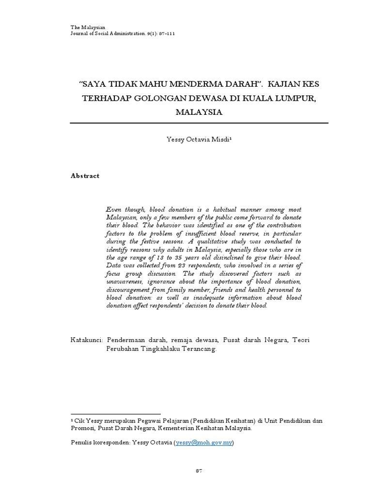 Saya Tidak Mahu Menderma Darah Kajian Kes Terhadap Golongan Dewasa Di Kuala Lumpur Malaysia