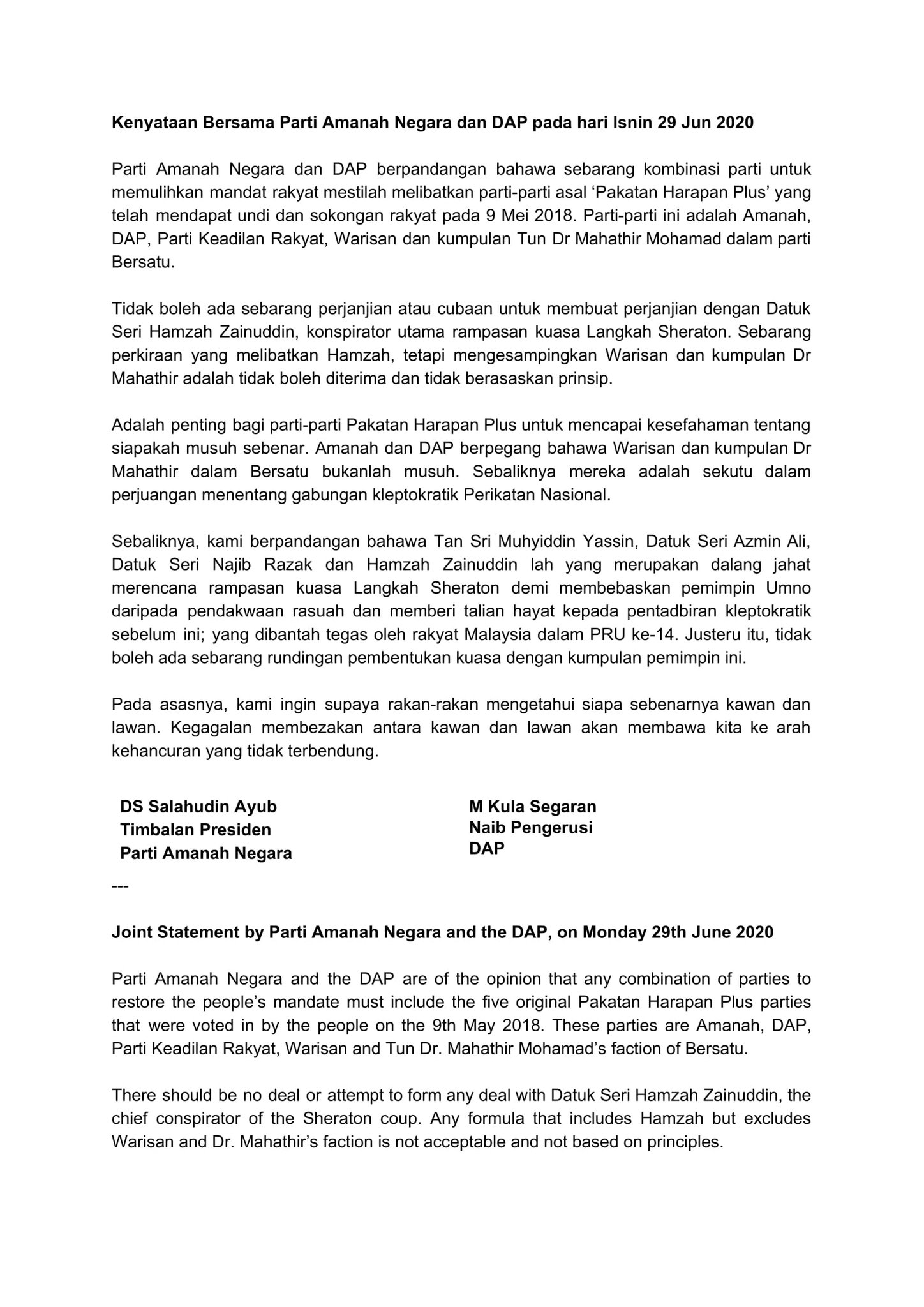 Emmanuel Samarathisa On Twitter Just In Dap Amanah Say There Not Be Any Deal Or Attempt To Form Any Deal With Hamzah Zainuddin The Chief Conspirator Of The Sheraton Coup This