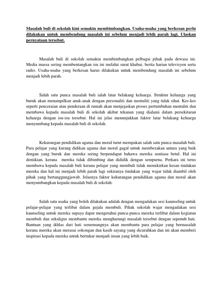 Langkah mengatasi gejala buli stpm. Punca dan cara mengatasi gejala buli 06 58 esei. Vandalisme gengsterisme dan buli merupakan jenayah yang acapkali didengar melalui media elektronik media cetak mahupaun percakapan orang ramai. Memang tidak boleh dinafikan bahawa dewasa ini kes buli yang berlaku di sekolah semakin berleluasa dan menjadi jadi. Buli fizikal pula melibatkan pukul memukul dan sepak terajang hingga menyebabkan kecederaan kepada mangsa buli.