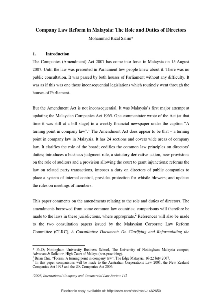 Pdf Company Law Reform In Malaysia The Role And Duties Of Directors