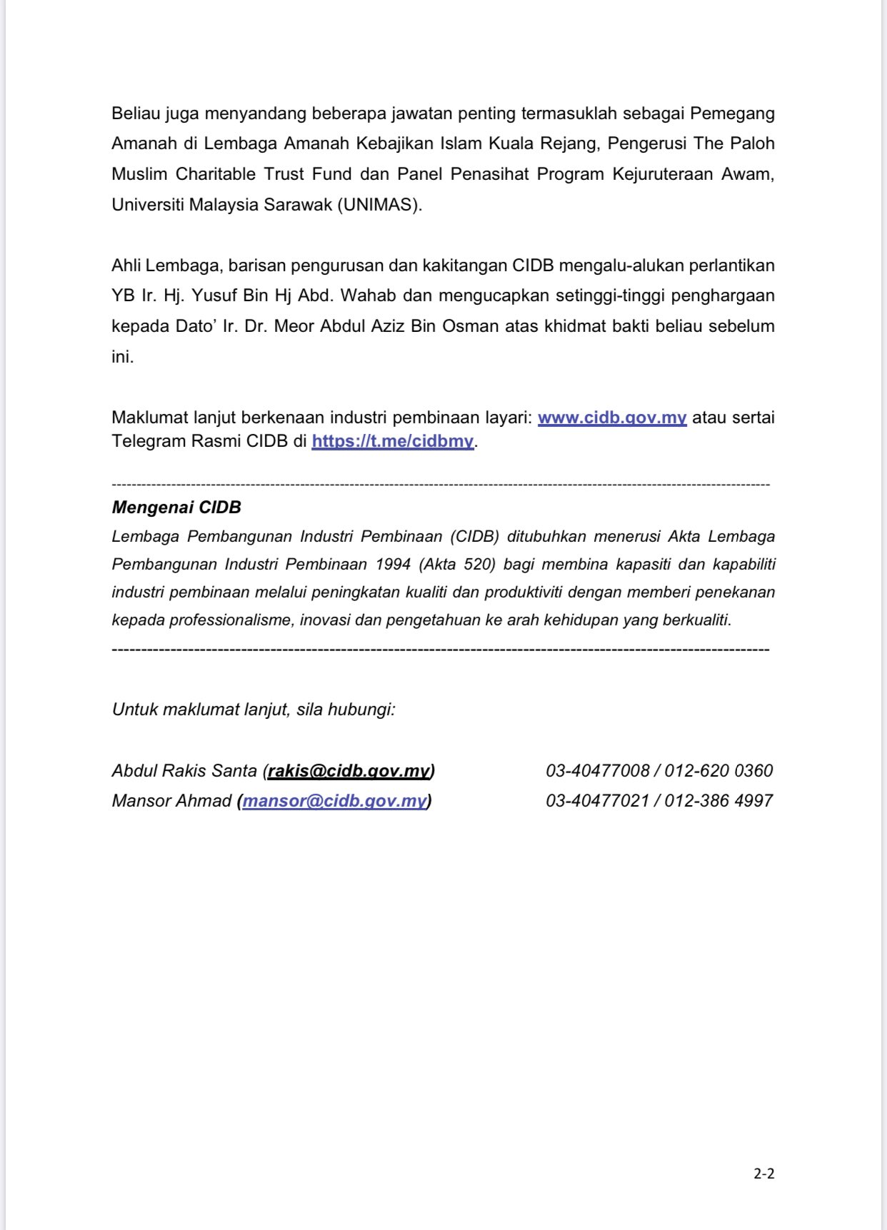 Tvsarawak On Twitter Cidbmalaysia Umum Pengerusi Baharu Lembaga Pembangunan Industri Pembinaan Malaysia Cidb Mengumumkan Pelantikan Ir Yusuf Abdul Wahab Sebagai Pengerusi Cidb Yang Baharu Berkuatkuasa 1 Mei 2020 Tvsarawak Https T Co Rpynlutrd4