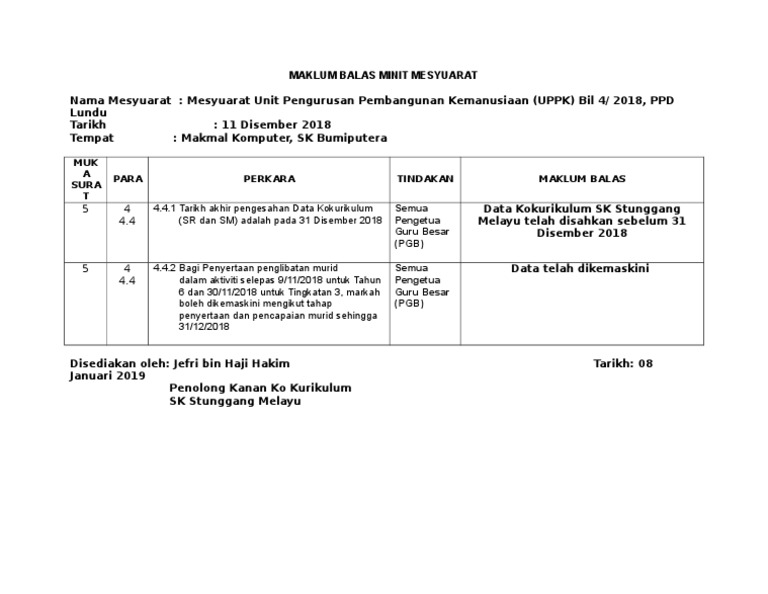 Maklum Balas Minit Mesyuarat Kk Bil 42018 Sk Stunggang Melayu Doc