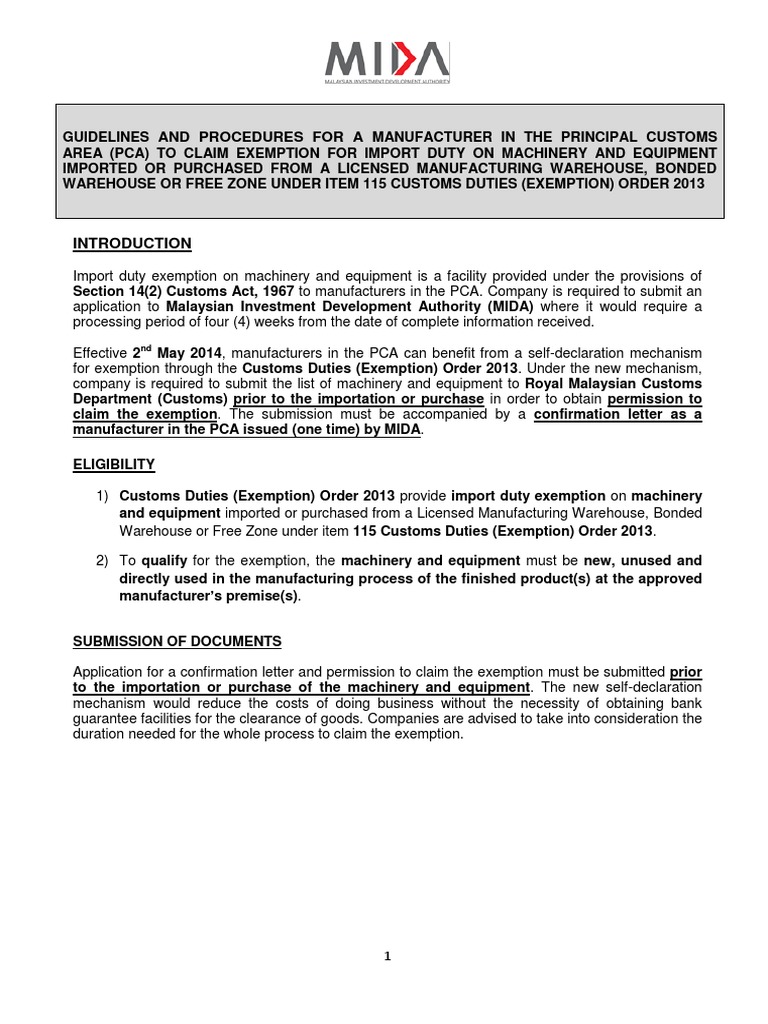 Import Duty Exemption On Machinery Equipment And Presentation Slide Equipment And Raw Materials Components Self Declaration Mechanism For Import Duty Exemption On Machinery Pdf Document