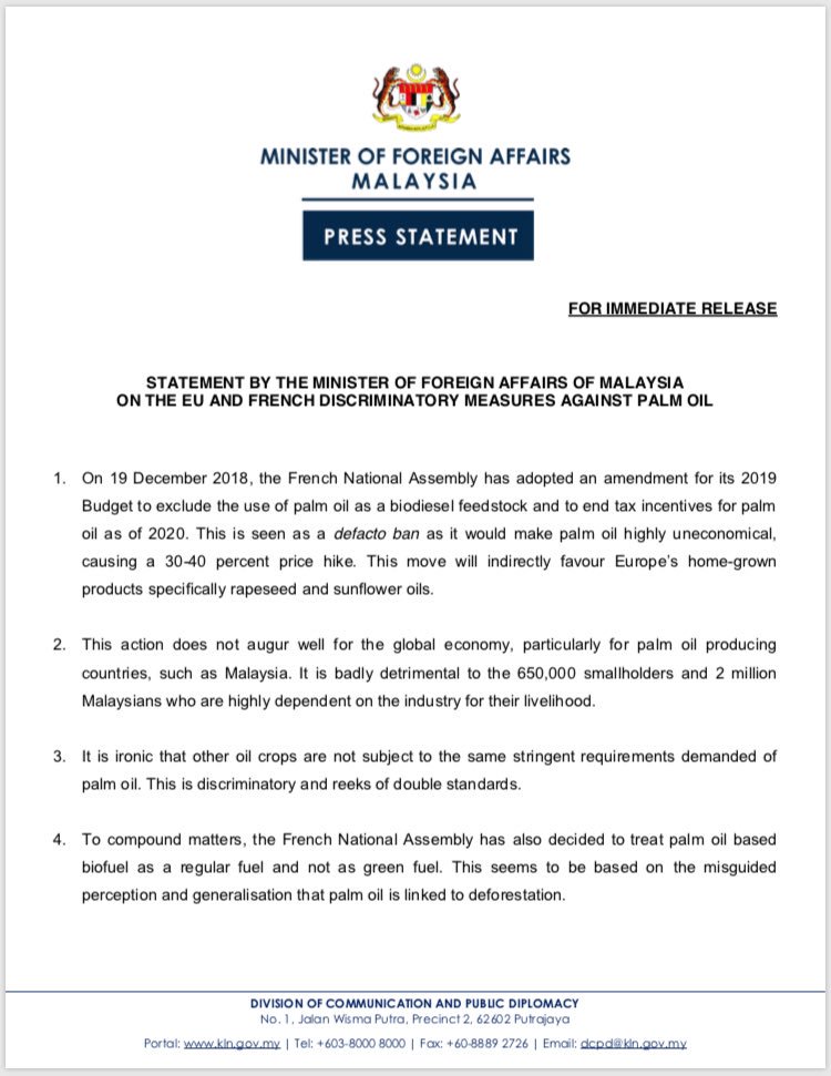 Wisma Putra On Twitter Statement By The Minister Of Foreign Affairs Of Malaysia On The Eu And French Discriminatory Measures Against Palm Oil Https T Co Bcww8rawu0