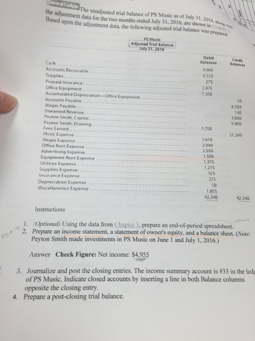The Unadjusted Trial Balance Of Ps Music As Of July 31 2016 Along With The Adjustment Data For The Two Months Ended July 31 2016 Are Shown In Chapter 3 Based Upon