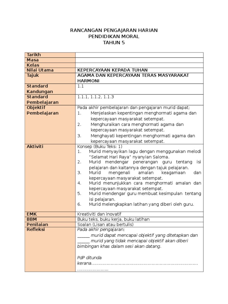 Rancangan Pengajaran Harian Nilai Kepercayaan Kepada Tuhan Tingkatan 2