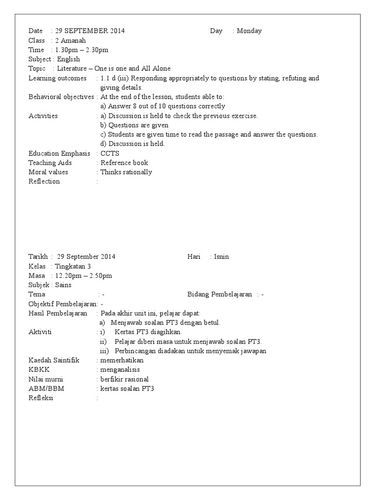 Sample Lessons Plan English Cefr Form 1 And Form 2 Lesson Plan Teachers