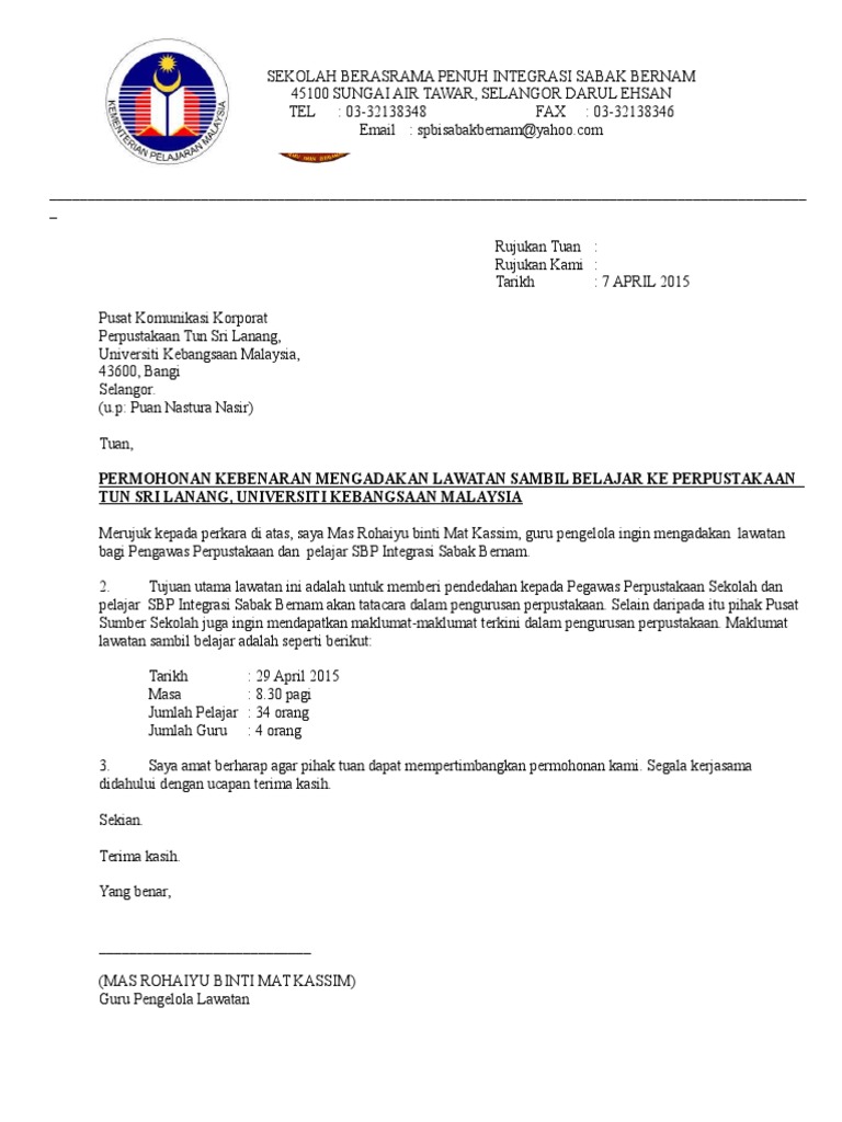 Surat Rasmi Permohonan Lawatan Sambil Belajar Ke Kilang Rasmi F