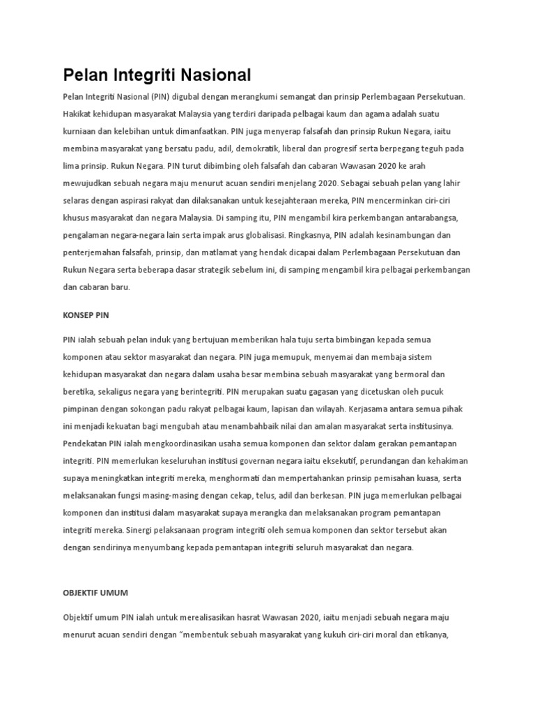 Objektif pelan integriti nasional pin. Pelan integriti nasional ialah sebuah induk yang bertujuan memberikan hala tuju serta bimbingan kepada semua komponen atau sekitar masyarakat dan negara pelan integriti nasional juga memupuk menyemai dan membaja sistem kehidupan masyarakat dan negara dalam usaha besar membina sebuah masyarakat yang bermoral dan beretika sekaligus negara yang berintegriti pelan integriti nasional suatu gagasan. Selaras dengan hasrat tersebut pelan integriti nasional pin dibangunkan pada tahun 2004 bagi tujuan menggubal strategi dan memberi hala tuju bagi semua sektor masyarakat supaya mereka dapat bekerjasama dan mengambil bahagian secara langsung dalam usaha memantapkan nilai etika dan integriti. Hakikat kehidupan masyarakat malaysia yang terdiri daripada pelbagai kaum dan agama adalah suatu kurniaan dan kelebihan untuk dimanfaatkan. Pelan integriti nasional pin dilaksanakan secara berperingkat dan tempoh 2004 2008 merupakan fasa pertama pelaksanaannya.