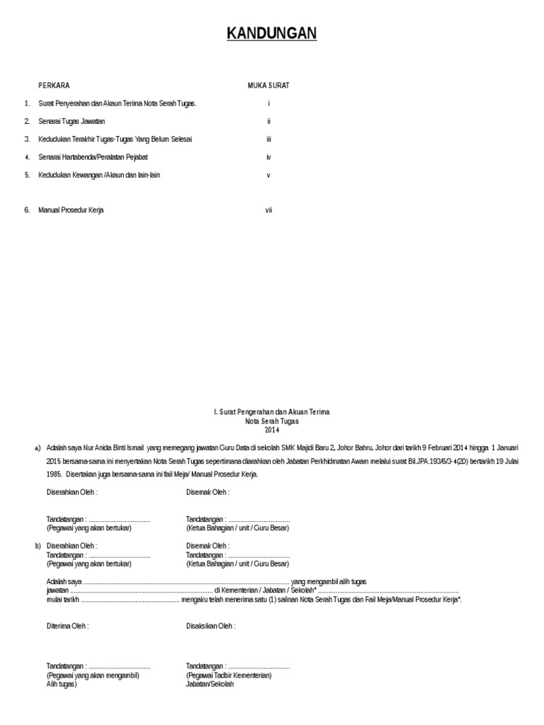 Borang Nota Serah Tugas Untuk Pertukaran 1 Docx Lampiran A Format Nota Serah Tugas Kandungan Perkara Muka Surat 1 Surat Penyerahan Dan Akuan Terima Course Hero